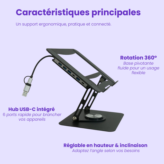 Avec sa rotation 360°, son hub USB-C intégré et son support téléphone réglable, il offre le parfait équilibre entre ergonomie, design et productivité.